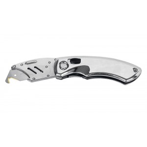 • Metalowy nożyk na ostrza trapezowe - 490283. Wymiana ostrzy odbywa się po zwolnieniu blokady (czarny suwak). Nożyk można wyposażyć we wszystkie standardowe ostrza trapezowe.