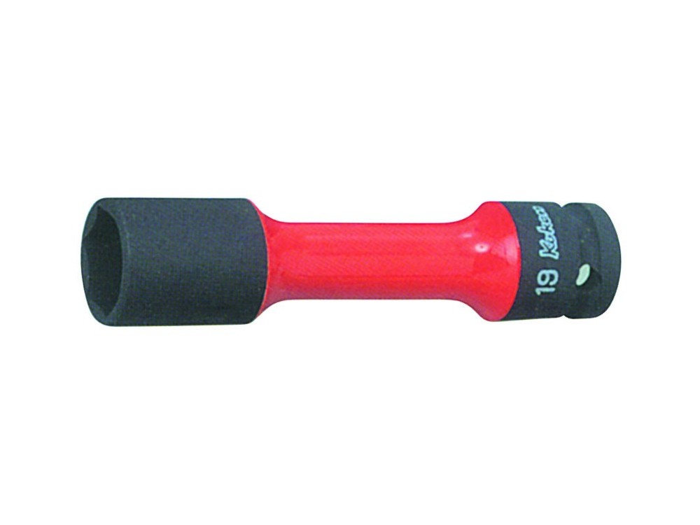 Klucz nasadowy do montażu nakrętek do kół. O długości 110 mm i rozmiarze 19 mm umożliwia głęboki wkręt nakrętek. Szczególne nadaje się do nakrętek kół na felgach aluminiowych, gdzie przestrzeń miedzy nakrętką a felgą jest niezwykle mała. Plastikowa nasadka ochronna, chroni felgę koła przed porysowaniem.
