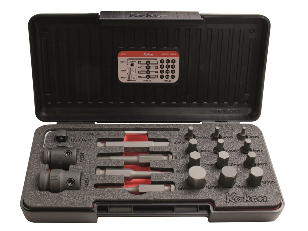Zestaw zawiera: 16 bitów, popularnych w przemyśle, dwa adaptery na 3/8“ i 1/2“ oraz klucz sześciokątny w rozmiarze 4.