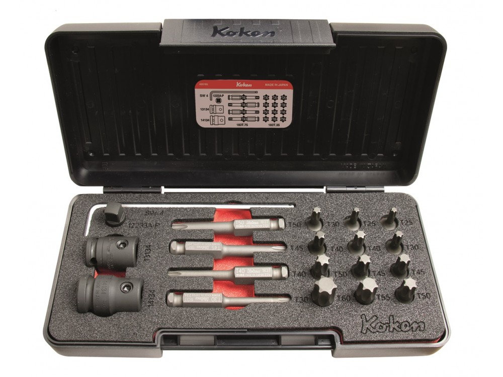 Zestaw zawiera: 16 bitów, popularnych w przemyśle, dwa adaptery na 3/8“ i 1/2“ oraz klucz sześciokątny w rozmiarze 4.