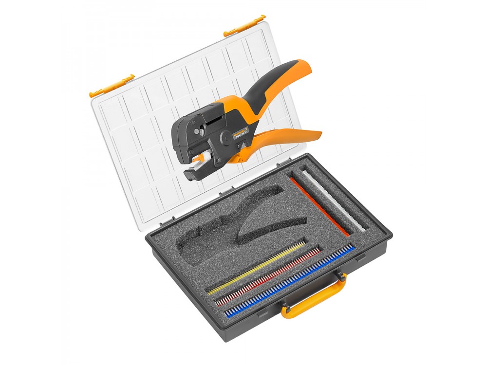 Zestaw stripax® plus, do cięcia i zdejmowania izolacji z przewodów o przekroju do 2,5 mm². Również do zaciskania końcówek tulejkowych w taśmach od 0,5 - 2,5 mm². W zestawie 500 szt. H 0,5/14, 500 szt. H 0,75/14, 500 szt. H 1,0/14, 500 szt. H 1,5/14,500 szt. H 2,5/14.