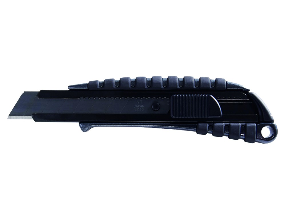Nożyk metalowy 18 mm. Rękojeść po części pokryte gumą. Z suwakiem, blokada ostrza. Wyposażony w czarne ostrze.