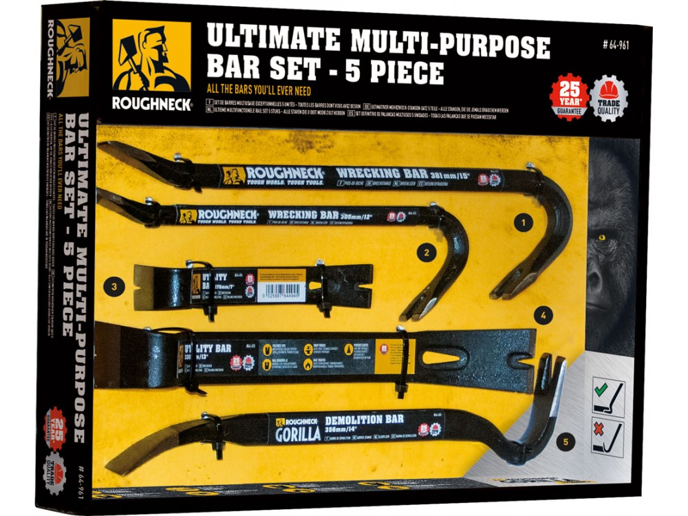 Roughneck Gorilla Bars® to jedne z najbardziej znanych i najlepszych jakościowo łomów wykonanych na rynku. Wykonane z wysokiej jakości stali kolejowej, kute matrycowo, hartowane oraz odpuszczane. Malowane proszkowo z polerowanymi końcówkami. Specjalne cechy Gorilla Bars® to mocny owalny trzpień, nisko profilowe pazury, które mieszczą się głębiej pod obrabianym przedmiotem, zwiększając siłę podważania a szeroka powierzchnia pazurowa, zapewnia lepszą kontrolę nad zapadnięciem się w obszarze użytkowania.