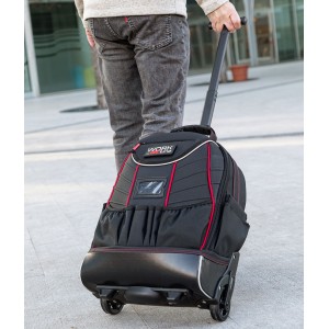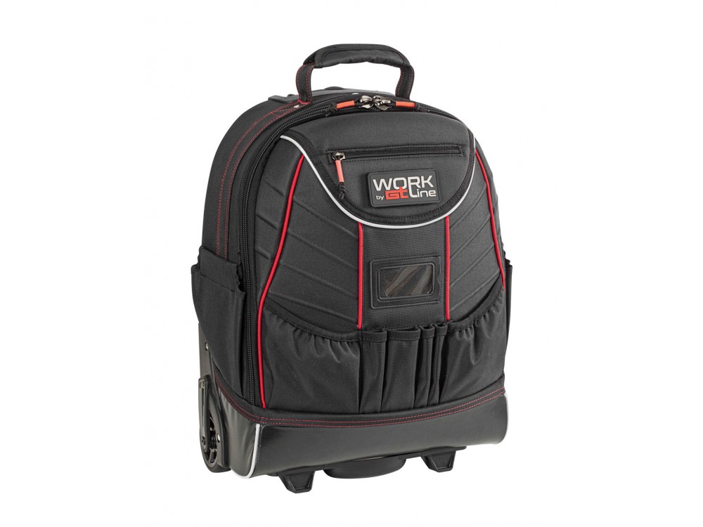 Wykonany z odpornej na ścieranie i rozdarcie tkaniny poliestrowej oraz wyściółki z pianki EVA. Na kółkach z teleskopową rączką i osłoną na kółka. Regulowane ramiączka. 2 wkłady na narzędzia obszyte kieszonkami. Specjalna przegroda na Laptop 15 ". Rączka ułatwiająca wygodne przenoszenie. Ponadto plecak wypsażony jest w zewnętrzne kieszenie (1 z zamkiem błyskawicznym).
