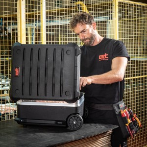 Walizka narzędziowa z wytrzymałą ramą aluminiową, wykonana z tworzywa HDPE z zamkiem TSA. (zamki TSA – umożliwiają służbom celnym otwarcie zamka bez uszkodzeń). Walizka nadaje się szczególnie dla podróżujących technikom serwisowych w przemyśle maszynowo budowlanym. Górne oraz dolne wieko połączone są aluminiową ramą. Dolne wieko zapewnia dużą przestrzeń na przechowywanie dużych narzędzi, elektronarzędzi. Walizka jest mobilna i można ją sztaplować.